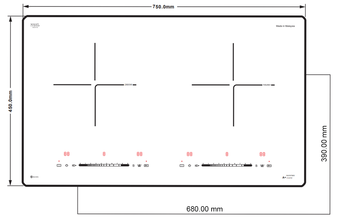 • Mặt kính Schott Ceran vát 4 cạnh, bo viền hợp kim nhôm cao cấp