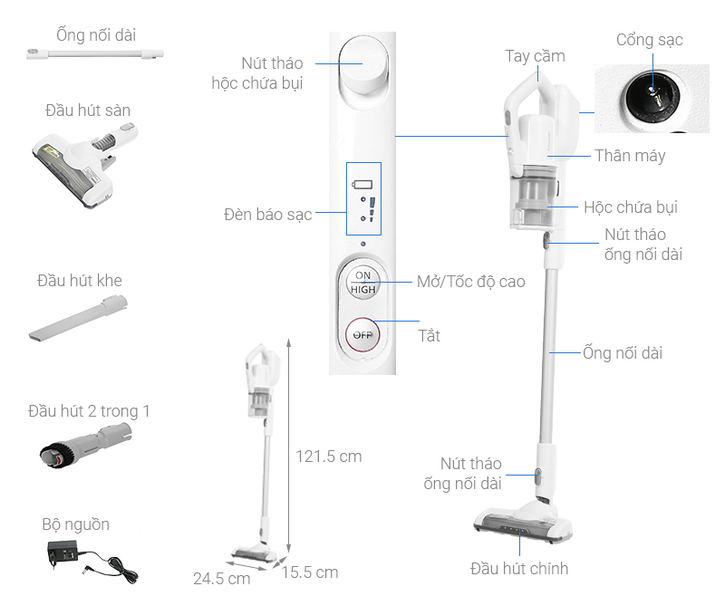 Tiện ích Đèn LED chiếu sáng; Đèn chỉ báo pin; Điều chỉnh sức hút bụi; Thiết kế 2 trong 1 (có thể tháo rời khỏi ống nối/thân máy)