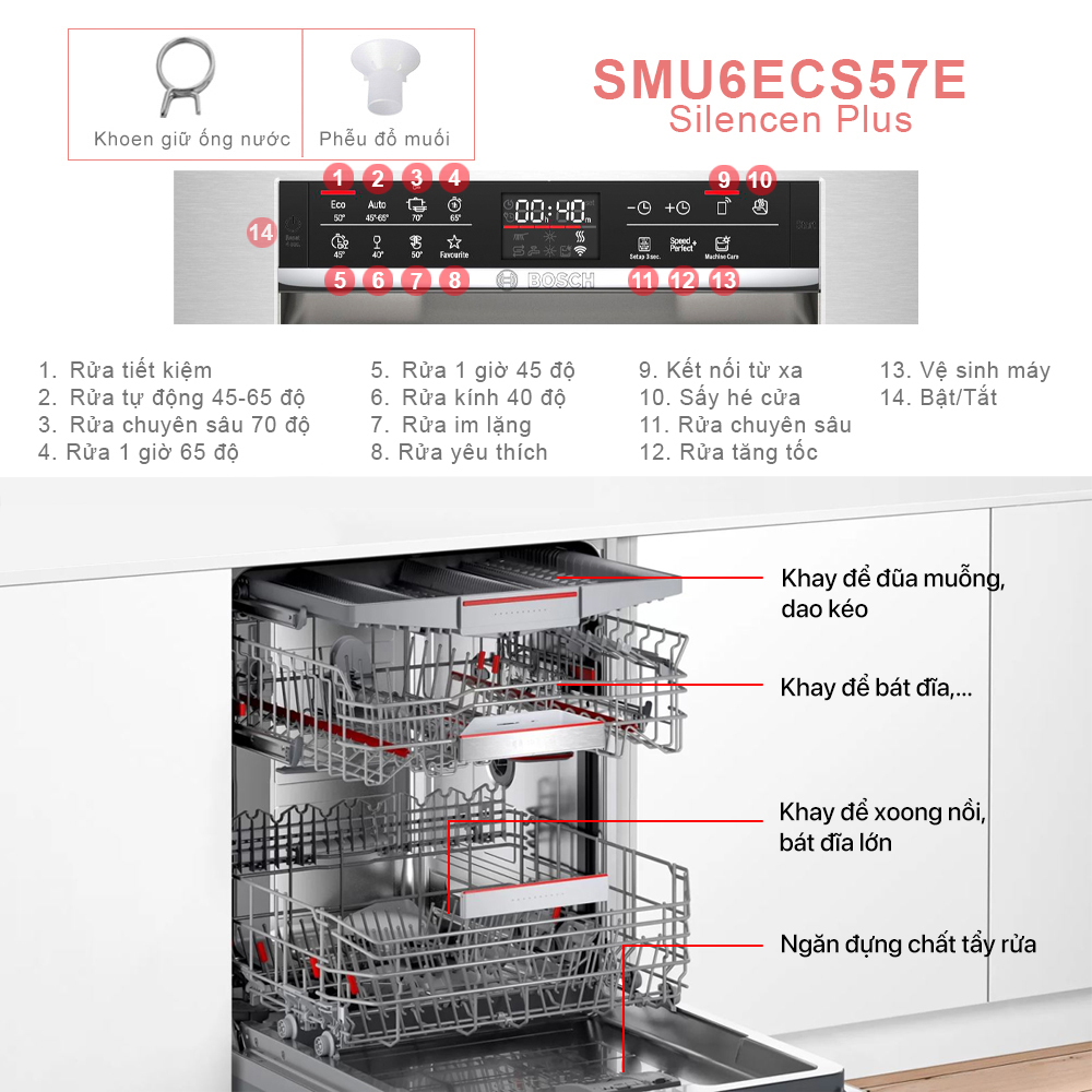 Bosch SMU6ECS57E thuộc dòng máy rửa bát series 6 của Bosch, sở hữu nhiều ưu điểm nổi bật như: