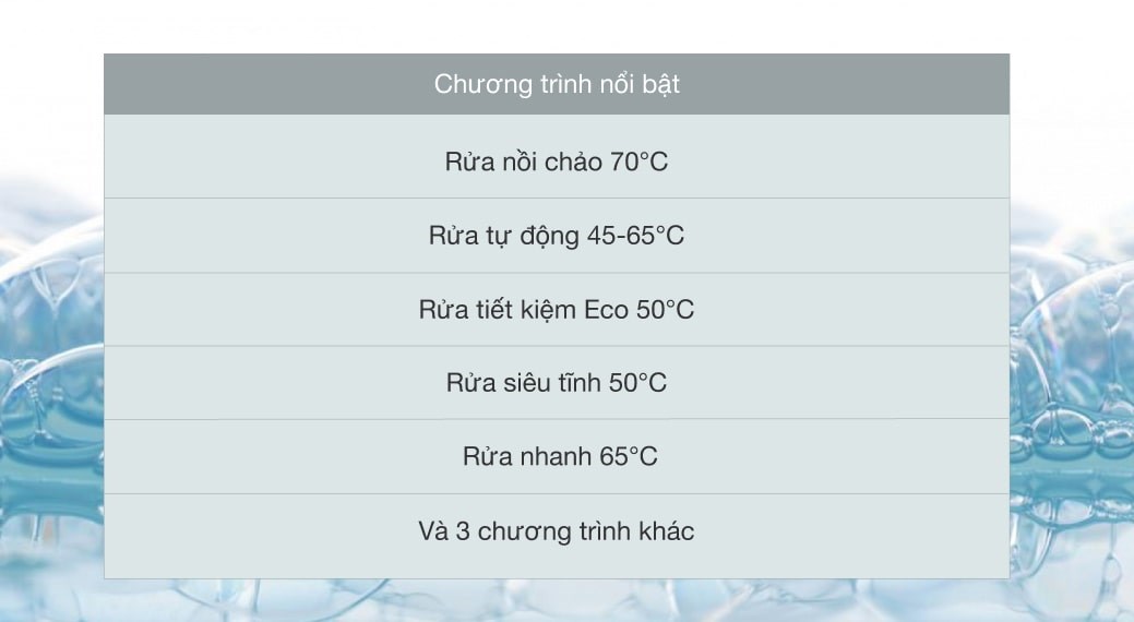 - 8 chương trình rửa bao gồm: Rửa chuyên sâu 70 độ C (Intensive), rửa tự động 45 - 65 độ C (Automatic), rửa tiết kiệm 50 độ C (Eco), rửa yên tĩnh 50 độ C (Silence), rửa ngắn 60 độ C (Short), rửa ly 40 độ C (Glass), rửa nhanh 45 độ C (Quick), rửa tráng (Pre Rinse).