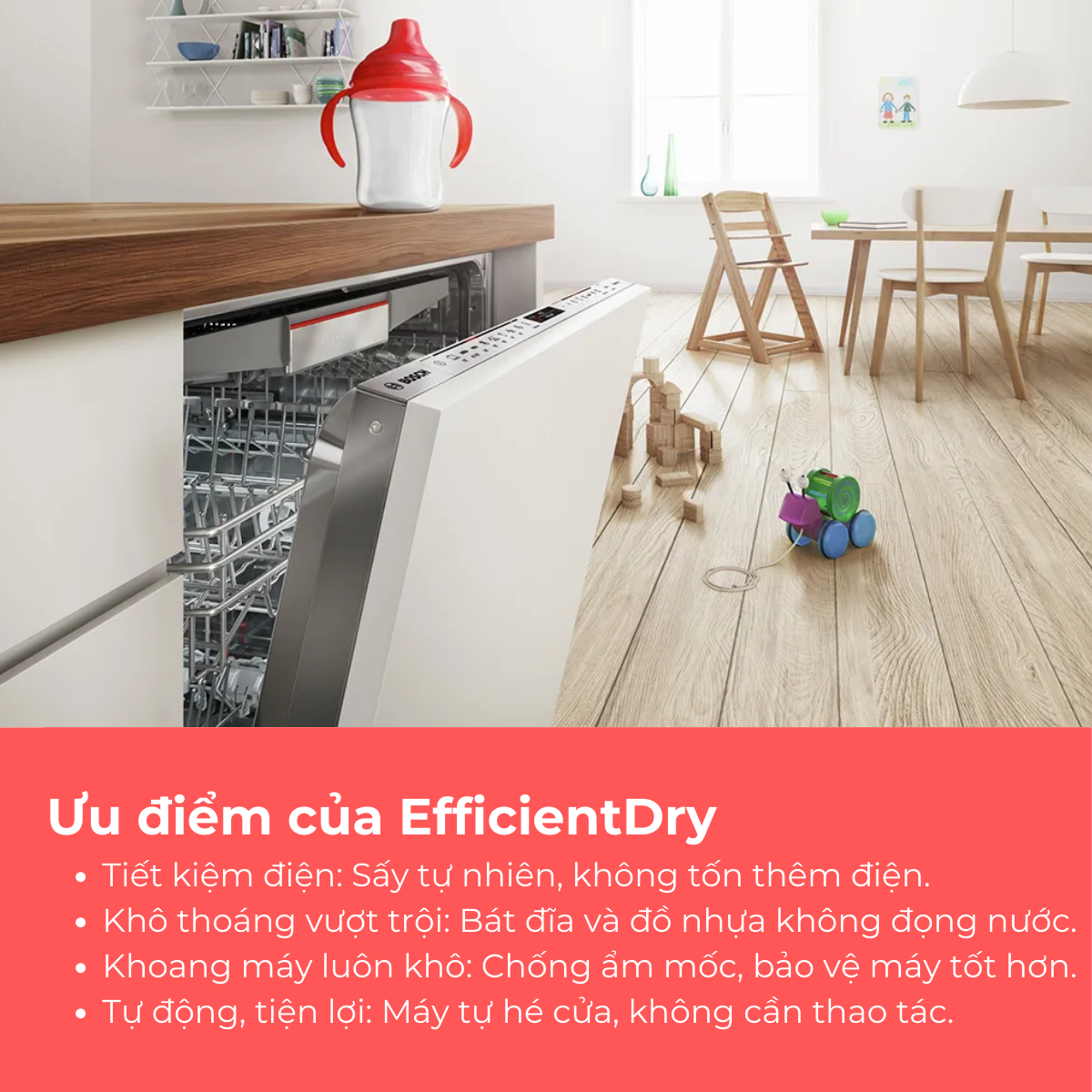 EfficientDry không phải là một công nghệ phức tạp, nhưng lại giải quyết đúng một vấn đề mà nhiều máy rửa bát gặp phải: hơi nước không có đường thoát.