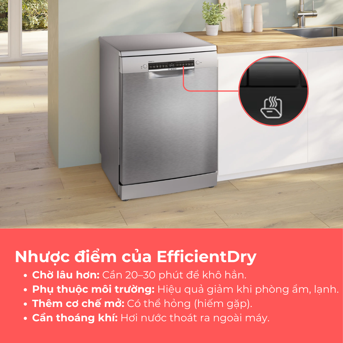 EfficientDry là một giải pháp thông minh, nhưng nếu nhìn đúng bản chất, đây không phải là công nghệ “giải quyết triệt để mọi tình huống”. Nó tối ưu rất tốt trong điều kiện phù hợp, nhưng vẫn có những giới hạn mà người dùng cần hiểu rõ trước khi lựa chọn máy rửa bát.