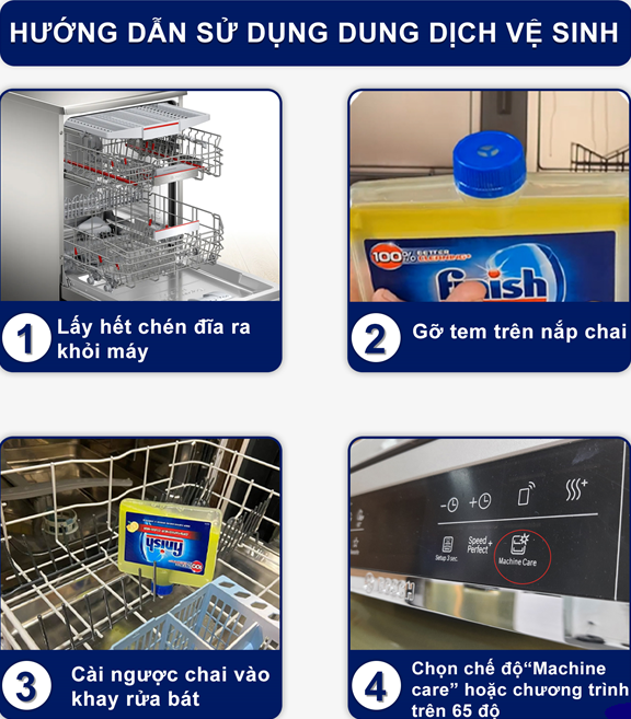 • Làm sạch hoàn toàn các vết bẩn dầu mỡ và vôi bám lâu ngày bên trong máy rửa chén.