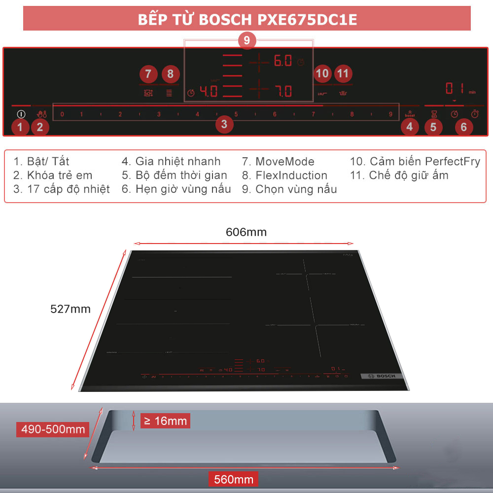 Bếp từ PXE675DC1E là sản phẩm thuộc thương hiệu danh tiếng và uy tín Bosch - Đức, sản xuất và nhập khẩu nguyên chiếc từ Tây Ban Nha.