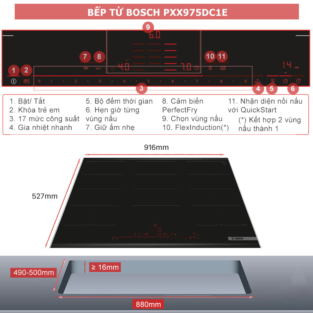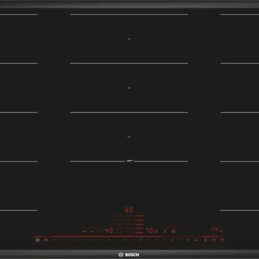 Bếp từ Bosch PXX975DC1E sở hữu bảng điều khiển cảm ứng rộng, ẩn khi tắt bếp, dễ thao tác chỉ với một chạm.