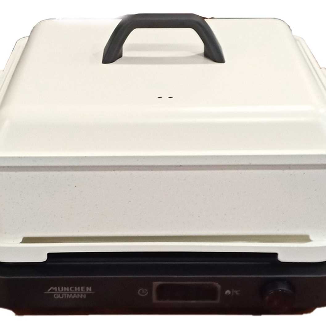 Bề mặt bếp, khay nướng và nắp được làm bằng bằng hợp kim nhôm phủ sứ chống dính, dễ lau chùi.
