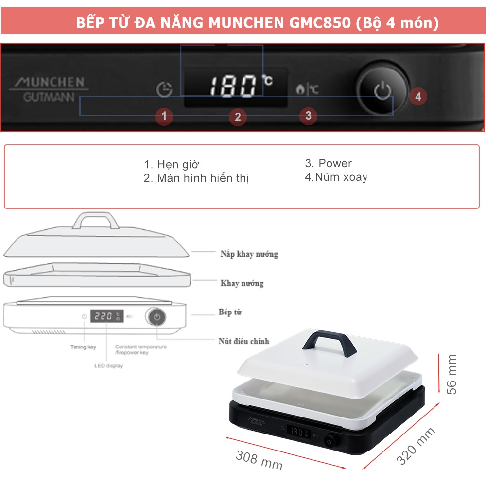 Quy cách: Bếp cảm ứng từ đa năng GMC850 bao gồm Bếp từ đơn, khay nướng, nồi lẩu (4,5 lít) và nắp ( bộ 4 món )