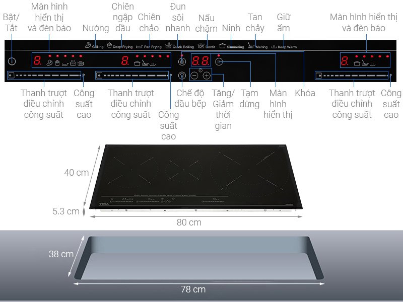 • Tổng công suất lớn 7200W, mỗi vùng nấu đều có Booster
