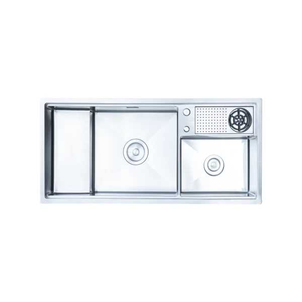 Thiết kế 2 hố lệch + bàn chờ Hai hố lệch giúp tách khu vực rửa và sơ chế, rất tiện cho nhu cầu sử dụng đa dạng.