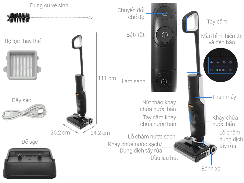 0.72 lít chứa bụi và nước dơ, 0.74 lít chứa nước sạch