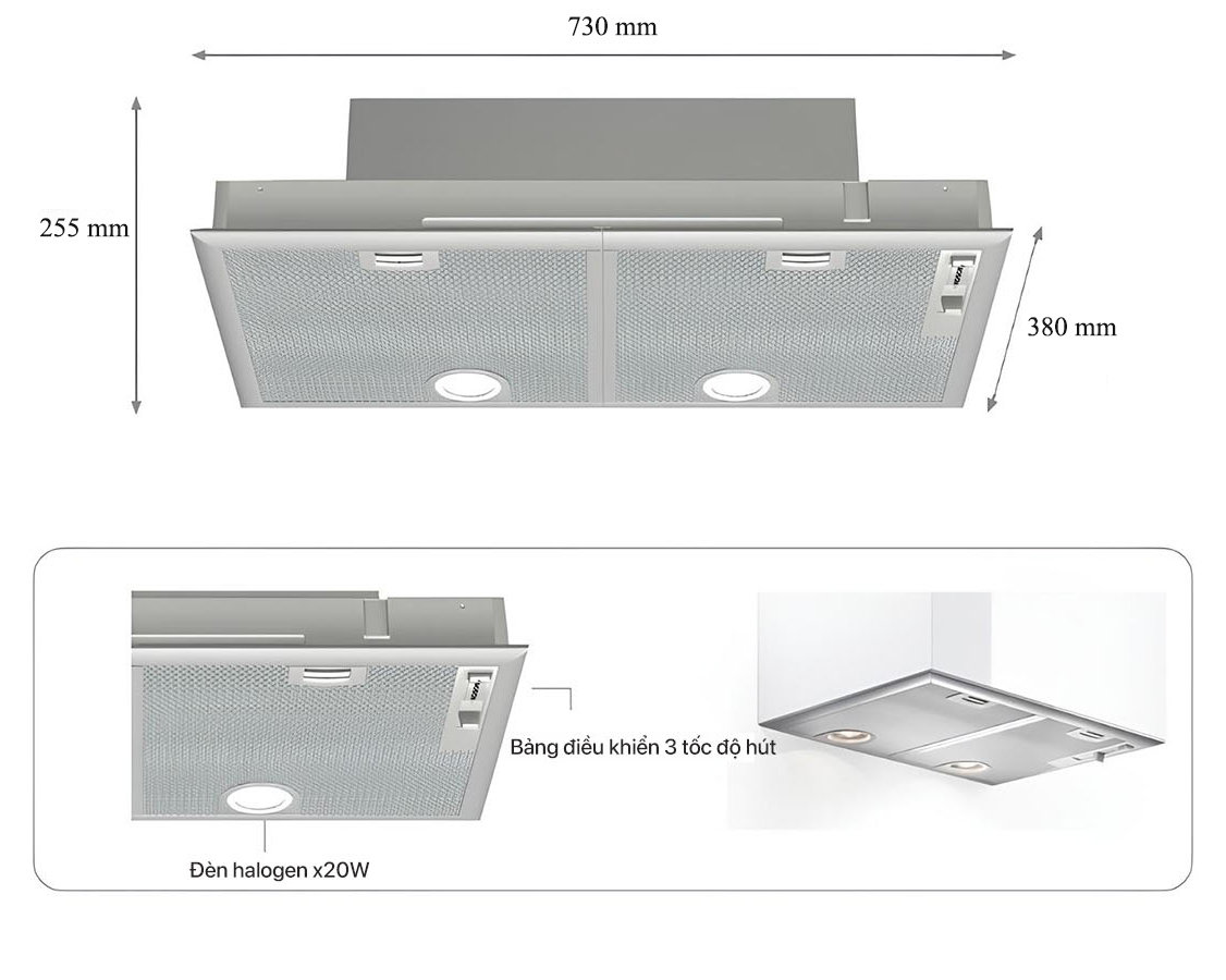 Máy được trang bị 2 đèn chiếu sáng halogen, với công suất 6W tiết kiệm năng lượng mang lại ánh sáng trắng và tốt cho khu vực bếp nấu