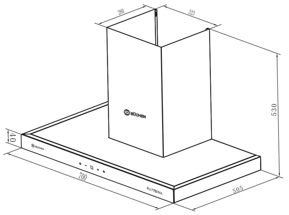 Kiểu dáng Shape Tornado sang trọng: Với kiểu dáng T-shape Tornado gắn tường độc đáo, Buchen BU77DWA không chỉ làm sạch không khí trong không gian nấu ăn mà còn làm cho bếp trở nên rộng rãi và đẹp mắt hơn.