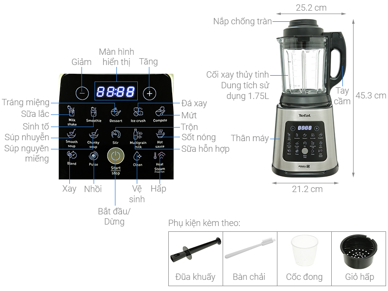 Chức năng Xay đá; Vệ sinh máy; Sữa lắc; Sinh tố; Làm mứt; Hấp; Tráng miệng; Súp nhuyễn; Súp nguyên miếng; Trộn; Sữa hỗn hợp; Sốt nóng; Xay; Nhồi