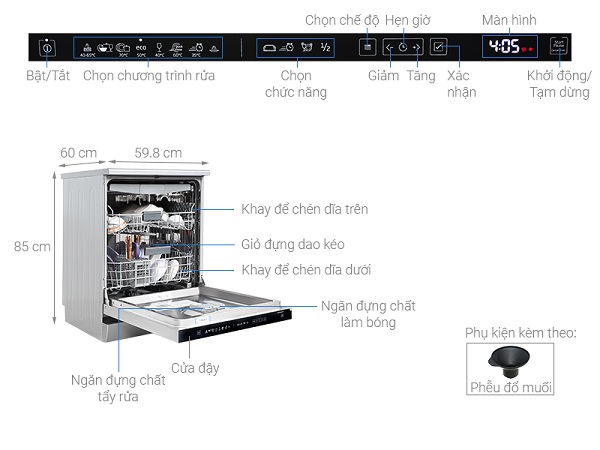 Cảm biến báo muối và chất tẩy rửa:Cảm biến tự động phát hiện mức độ muối và chất tẩy rửa sau đó hiển thị thông báo trên màn hình điều khiển. Tính năng này giúp người dùng dễ dàng theo dõi và bổ sung đúng lượng muối và chất tẩy rửa khi cần thiết, đảm bảo hiệu suất làm sạch và bảo vệ máy khỏi các vấn đề liên quan đến chất tẩy rửa.