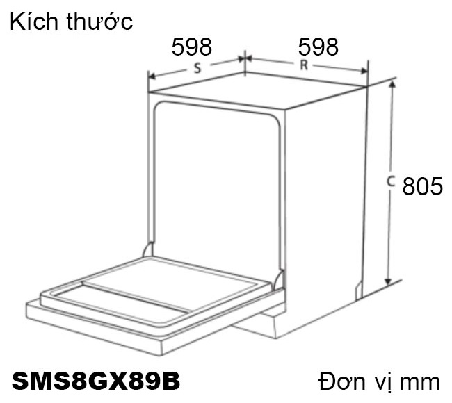 598 (Rộng) x 598 (Sâu) x 775–805 (Cao) mm