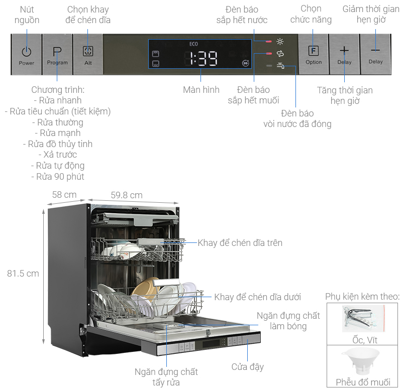 Mức tiêu thụ điện : 0.65 kWh/ 1 lần rửa