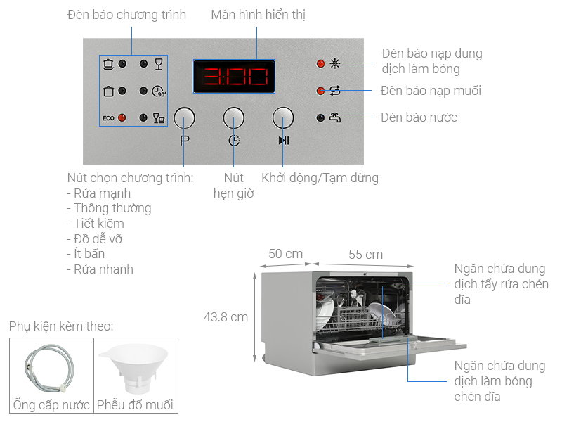 Chương trình rửa 6 chương trình: Rửa nhanh – Rửa tiết kiệm – Rửa ít bẩn – Rửa thường – Rửa mạnh – Rửa đồ thủy tinh