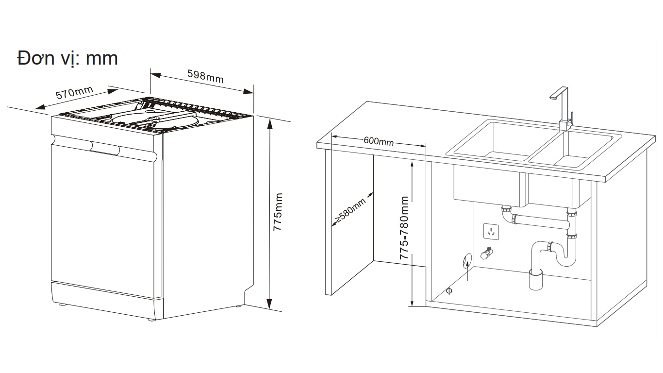 Kích thước 598 x 590 x 805 mm