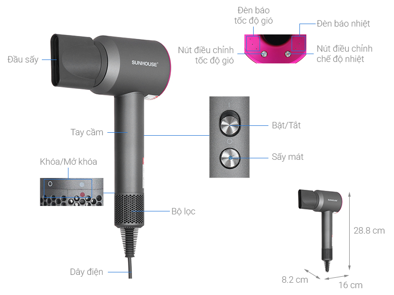 Tiện ích Sấy ion làm mượt tóc; Sấy tốc độ cao; Đầu sấy hẹp tạo kiểu