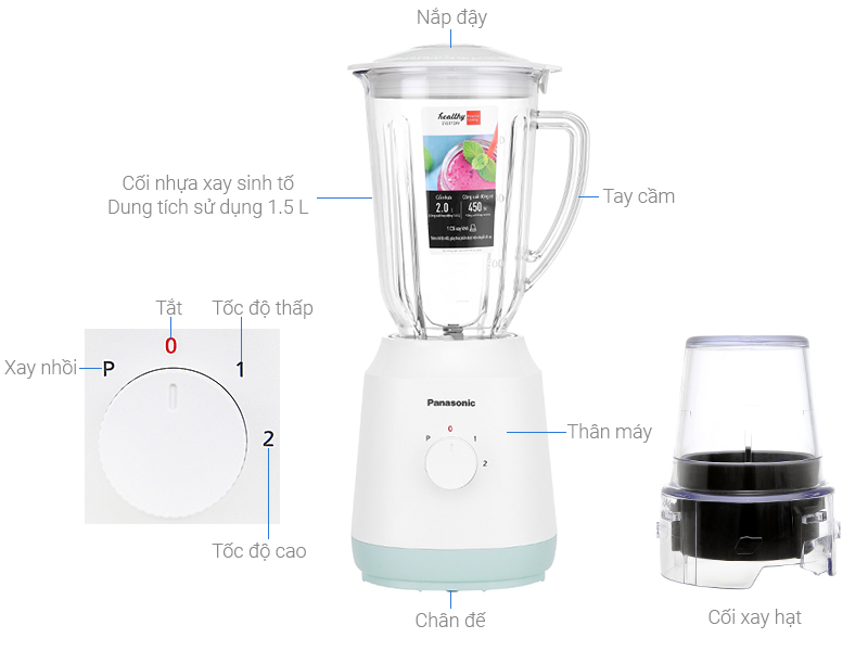 Chức Năng Xay sinh tố, xay rau củ, xay hạt, xay gia vị (hành, tỏi, ớt, nấm,...), xay cháo nóng, xay cháo nguội