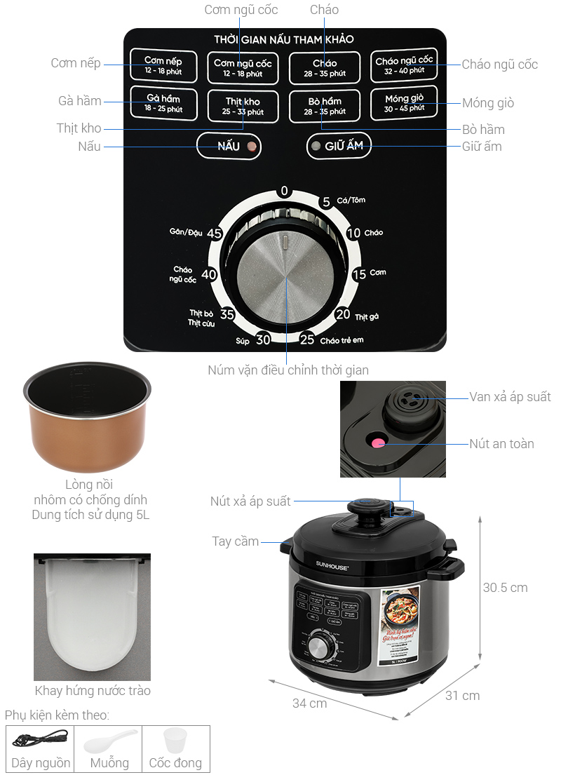 Chức năng nấu Đậu/Gân, Nấu cơm, Nấu cháo, Giữ ấm, Súp, Cơm nếp, Gà hầm, Thịt kho, Móng giò, Bò hầm, Cơm ngũ cốc, Cháo ngũ cốc, Cháo trẻ em, Thịt bò/Thịt cừu, Cá/Tôm, Thịt gà