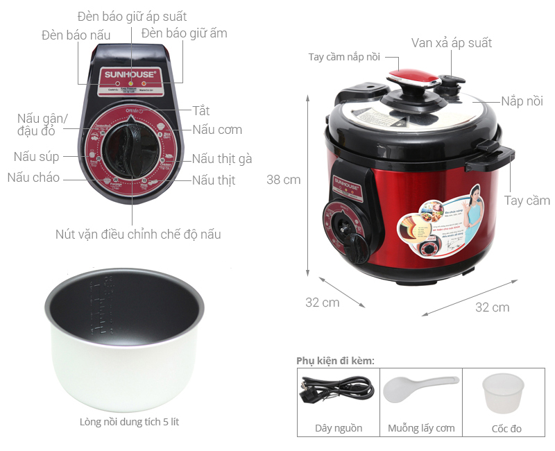 Chức năng nấu Nấu thịt; Nấu gà; Nấu cơm; Nấu cháo; Giữ ấm; Nấu đậu/gân; Súp