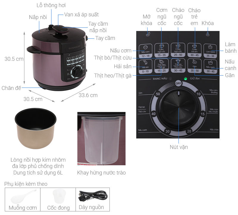 Chức năng nấu Nấu hải sản; Nấu gân; Nấu cơm; Nấu canh; Làm bánh; Giữ ấm; Cơm ngũ cốc; Cháo ngũ cốc; Cháo trẻ em; Thịt heo/Thịt gà; Thịt bò/Thịt cừu