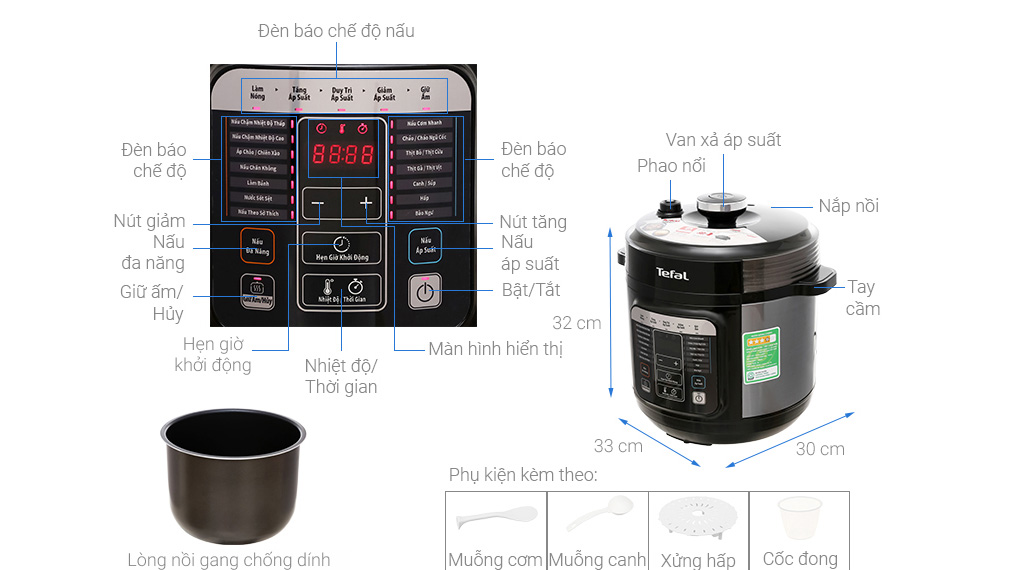 Chức năng nấu Nấu theo sở thích; Nấu sốt; Nấu soup; Nấu gà/vịt; Nấu cơm; Nấu chậm nhiệt độ thấp; Nấu chậm nhiệt độ cao; Nấu chân không; Nấu cháo; Nấu bò; Nấu bào ngư; Làm bánh; Hấp; Giữ ấm; Chiên thực phẩm