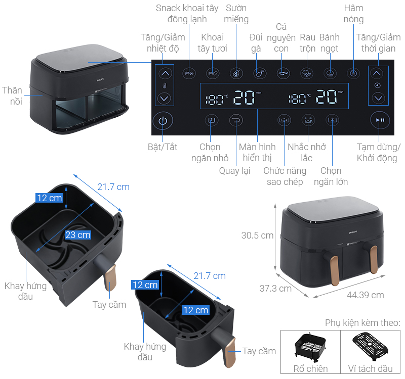 Tự ngắt khi kéo lòng nồi; Tự ngắt khi quá nhiệt; Nhắc đảo thực phẩm; Quạt đối lưu; 8 chương trình cài đặt; Chuông báo; Chức năng tạm dừng; Chức năng sao chép; Chức năng đồng bộ thời gian