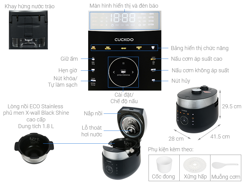 Tự động làm sạch; Chỉ báo bằng giọng nói; Hẹn giờ; Có xửng hấp; Cảm biến Energy Eye tiết kiệm điện; Turbo nấu nhanh; Giữ ấm 24 giờ; Áp suất cao đến 2.0 ATM