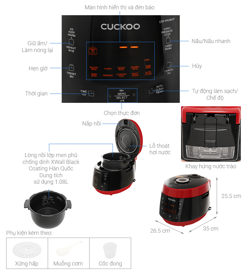 Chức năng Tự động làm sạch, Nấu đa năng, Nấu nhiệt độ cao, Nấu nhanh, Nấu cơm, Gạo trộn, Gạo lứt Gaba, Gạo lứt, Giữ ấm, Cơm cháy, Cháo đặc, Gạo trắng – gạo nếp
