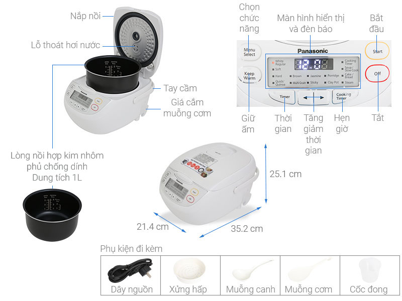 Chức năng Súp, Nấu thường, Nấu nhanh, Nấu chậm, Ngũ cốc, Hấp, Gạo thơm, Gạo nếp, Gạo lứt, Giữ ấm, Diêm mạch, Cơm niêu, Cơm mềm, Cơm khô, Cháo, Làm bánh/Bánh mì