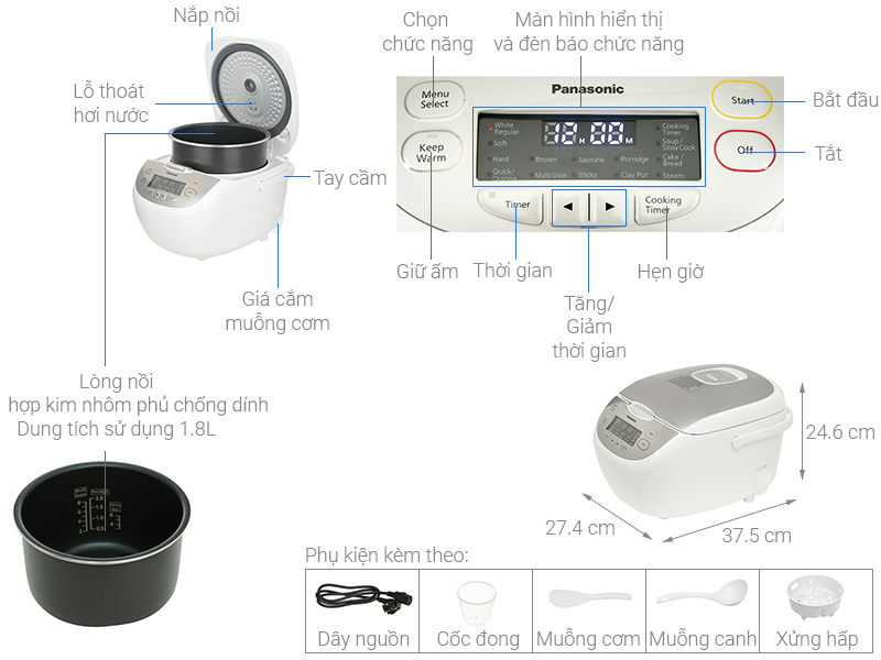Chức năng Súp, Nấu thường, Nấu nhanh, Nấu chậm, Ngũ cốc, Hấp, Gạo thơm, Gạo nếp, Gạo lứt, Giữ ấm, Cơm niêu, Cơm mềm, Cơm khô, Cháo, Nấu hạt Quinoa, Làm bánh/Bánh mì