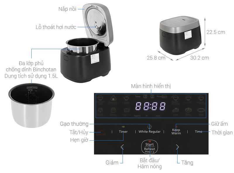 Chức năng Gạo thường, Súp, Nấu chậm, Làm nóng, Làm bánh, Hầm, Hấp, Gạo nếp, Gạo lứt, Gạo hạt ngắn, Giữ ấm, Cháo, Nấu nhanh/Hạt Quinoa, Tăng cường hương vị, Lên men