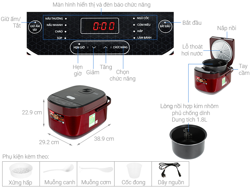 Chức năng nấu Súp, Nấu thường, Nấu nhanh, Ngũ cốc, Làm bánh, Hấp, Giữ ấm, Cơm niêu, Cháo
