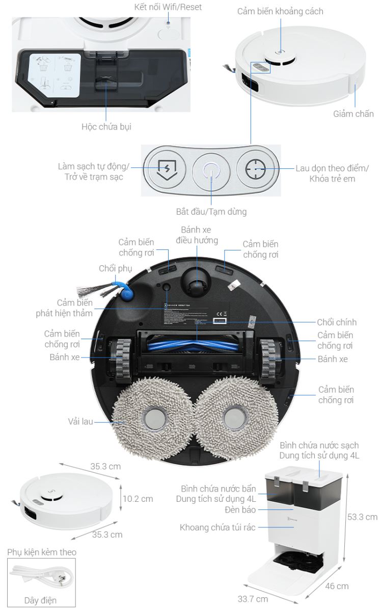 - Tự động đổ bụi, giặt, sấy khô vải lau