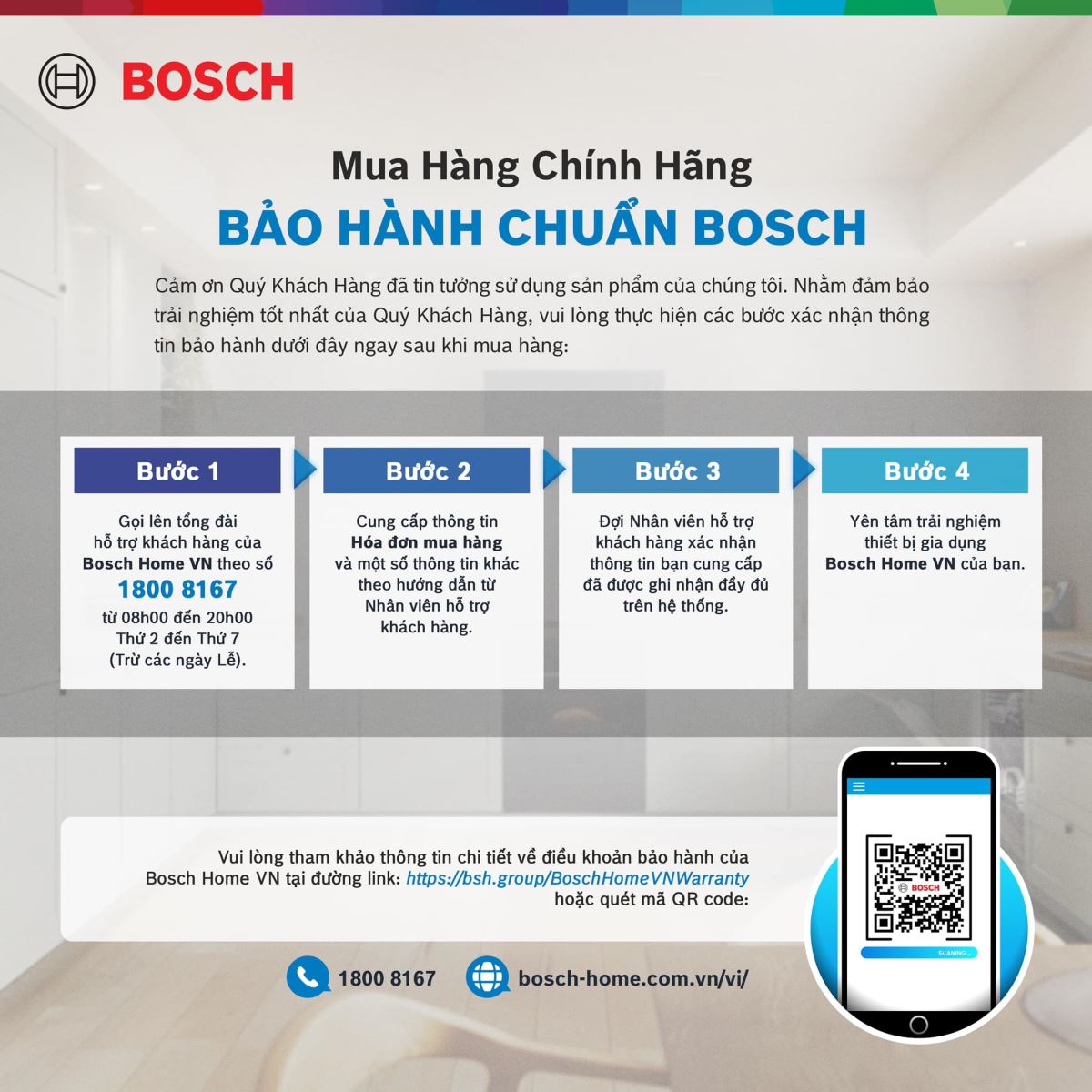 - Khi có nhu cầu bảo hành hoặc hỗ trợ kỹ thuật, liên hệ trực tiếp Tổng đài BSH Việt Nam để được phục vụ nhanh nhất