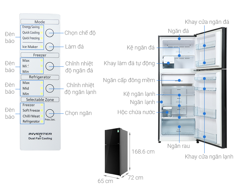 Tiện ích nổi bật Đệm cửa chống mốc – Đèn LED chiếu sáng – Khay thủy tinh chịu lực – Hộp đá xoay di động – Chế độ cấp đông nhanh – Làm đá tự động