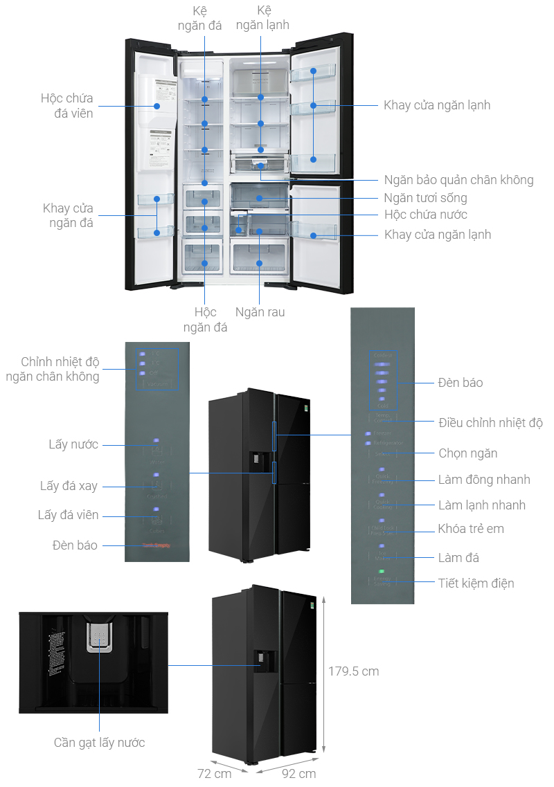 Đệm cửa chống mốc – Làm lạnh nhanh – Có khóa – Chế độ cấp đông nhanh – Bảng điều khiển cảm ứng bên ngoài cửa tủ – Chuông báo mở cửa – Lấy đá & nước ngoài – Làm đá tự động