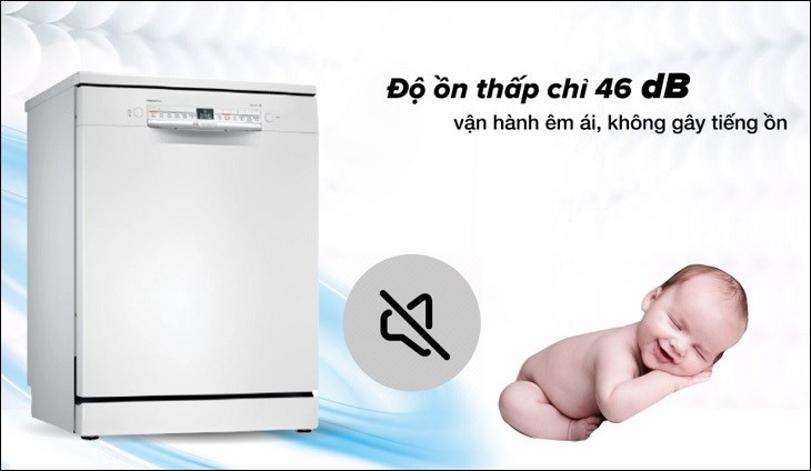 Khi hoạt động, dòng máy rửa chén Bosch này có độ ồn khoảng 42 - 46dB, tương đương với độ ồn của tiếng mưa rơi vừa phải, nên không gây khó chịu hay làm ảnh hưởng đến không gian sinh hoạt chung của gia đình.