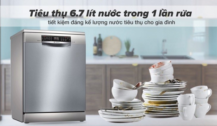 Máy rửa bát Bosch có sấy được thiết kế công suất mạnh mẽ đến 2400W, cho khả năng vận hành liên tục và ổn định. Bên cạnh đó, máy tiêu thụ tầm 8 - 9.5 lít cho mỗi lần rửa với số lượng chén bát dùng cho 3 - 4 bữa ăn người Việt.