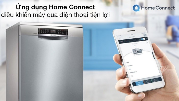 Với ứng dụng Home Connect được cài đặt trên điện thoại, người dùng có thể điều chỉnh được các chức năng trên máy, thậm chí có thể theo dõi được điện năng và lượng nước tiêu thụ mà thiết bị sử dụng.