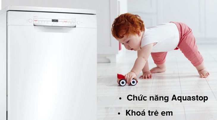 Chức năng khóa trẻ em giúp cho người lớn an tâm hơn khi sử dụng máy rửa chén Bosh có sấy trong gia đình, giúp phòng tránh trẻ nghịch phá mở cửa máy thường xuyên. Điều này cũng giúp cho máy có thể vận hành trơn tru và giảm thiểu tình trạng rò rỉ nước xảy ra.
