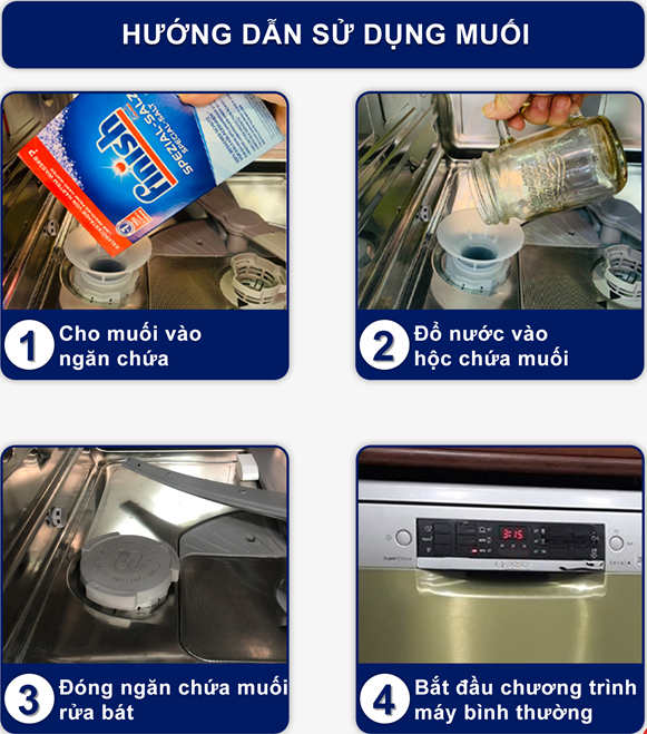 • Loại bỏ các chất cặn vôi, phân tử ion Mg+, Ca+, Fe+,… bám vào chén bát và máy rửa bát.