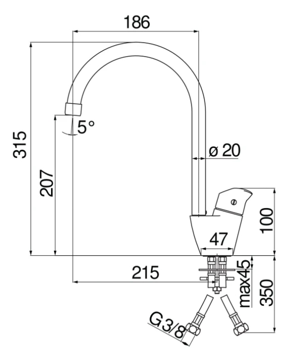 • Thiết kế cần cứng, thân vòi thân thiện với không gian bếp nhỏ hoặc tiêu chuẩn – chiều cao 315mm phù hợp nhiều chậu rửa.