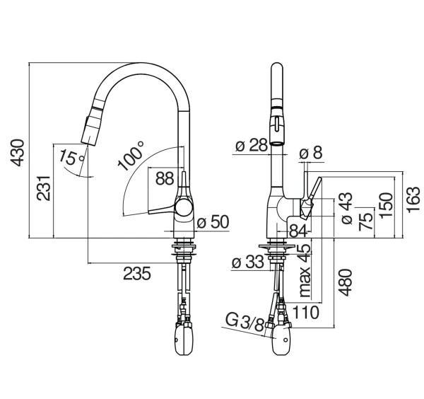 • Vòi có thân xoay 180° giúp mở rộng phạm vi tiếp cận và thao tác trong bếp.