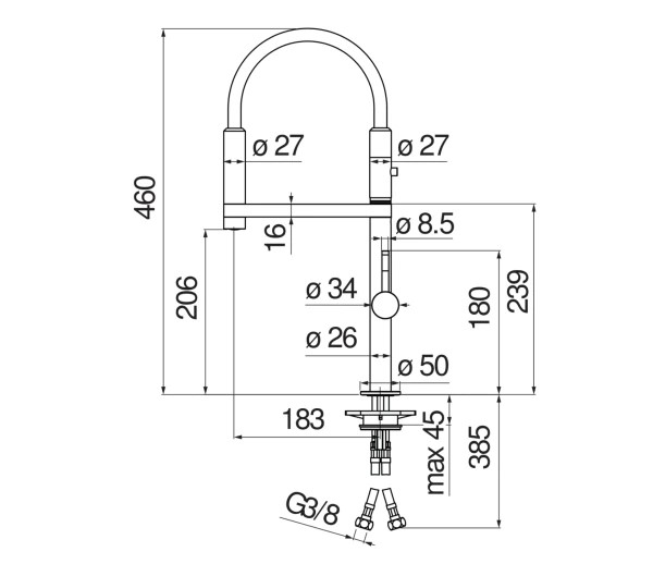 • Cần mềm linh hoạt bọc cao su đen mờ, giúp thao tác rửa xoong nồi, bồn lớn được dễ dàng hơn.