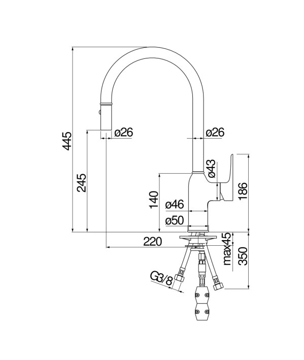 Thiết kế cần rút + đầu xoay linh hoạt Dễ thao tác, mở rộng phạm vi sử dụng quanh chậu bếp.