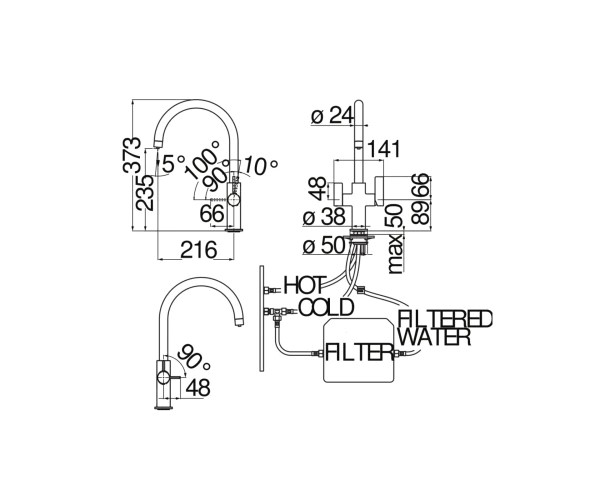 Thiết kế 3 đường nước: tích hợp nước nóng, nước lạnh và nước tinh khiết trong một vòi duy nhất — giúp tiết kiệm không gian bàn bếp và đơn giản hóa thao tác.